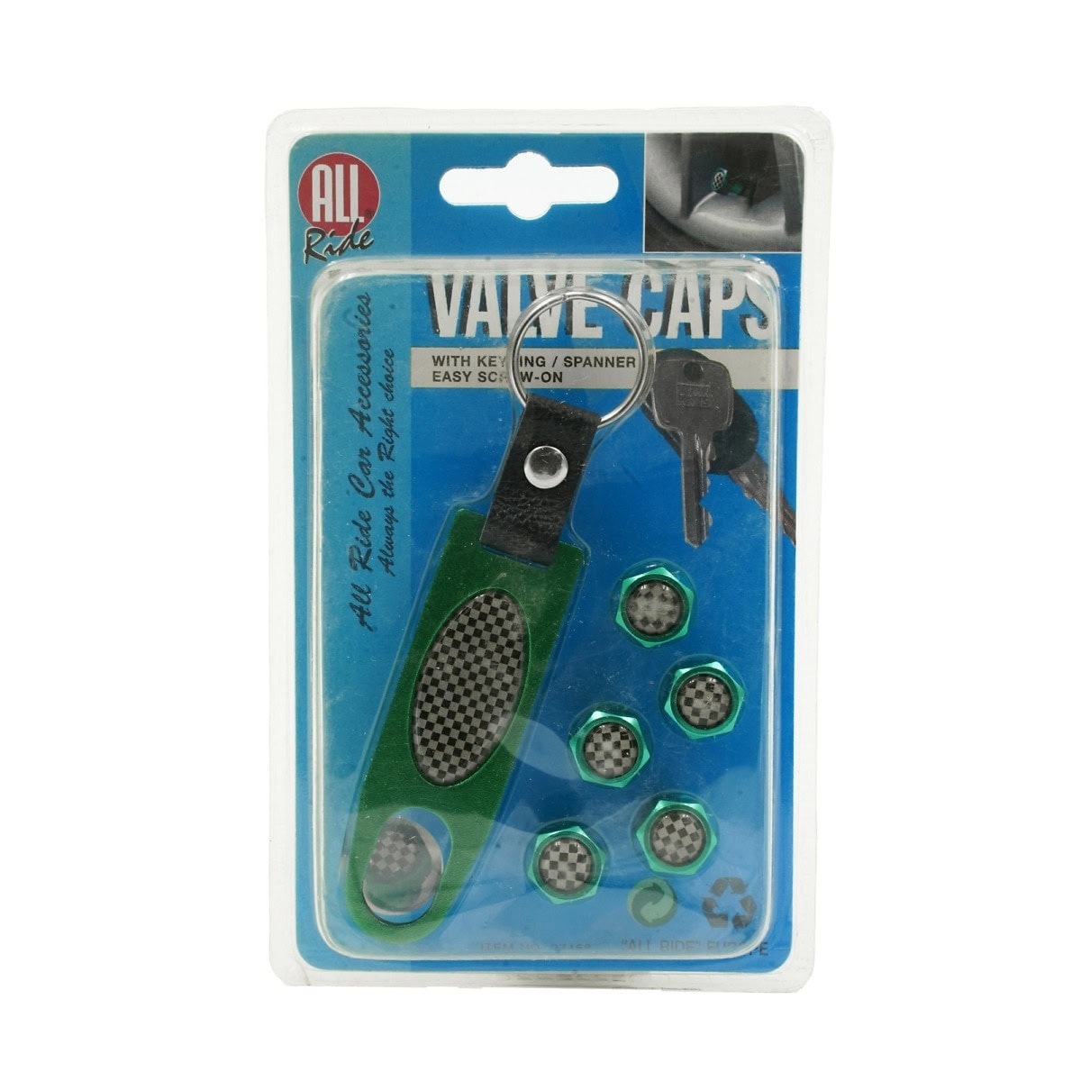Hauska avaimenperä sekä viisi kappaletta venttiilinhattuja ruutulippu-kuosilla. Perinteisten venttiilihattujen sijasta vihreät venttiilihatut tuovat menopeliisi asennetta!